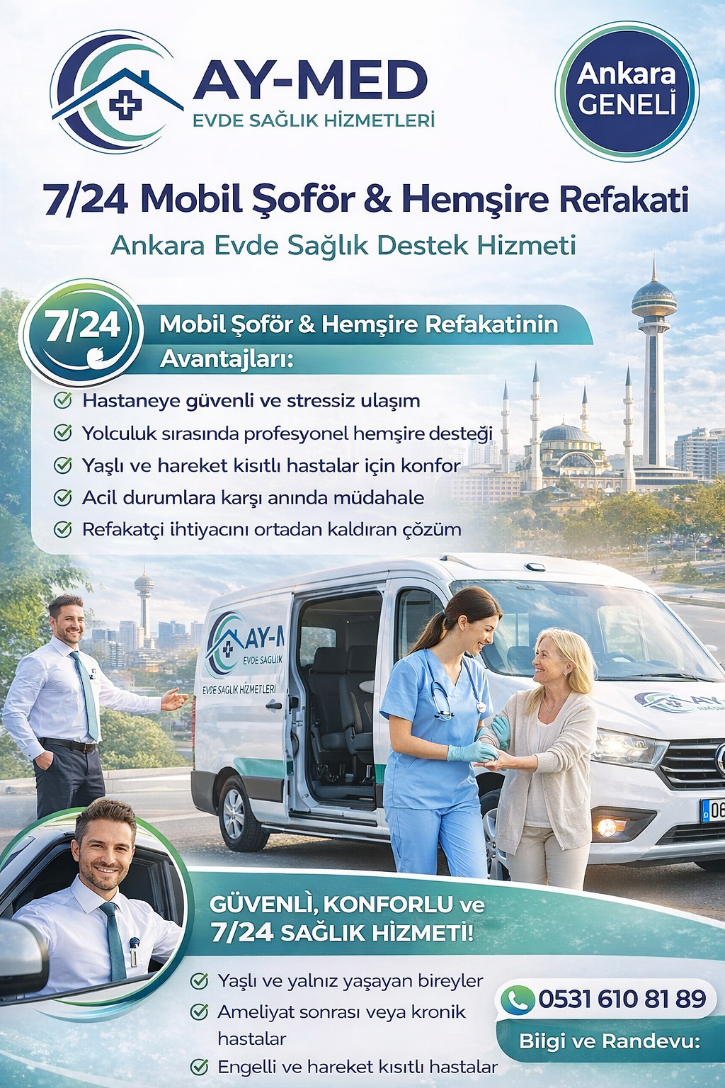 Ay-Med Evde Sağlık, Ankara’da 7/24 mobil şoför ve hemşire refakati denildiğinde güvenilir, profesyonel ve çözüm odaklı hizmet sunar.