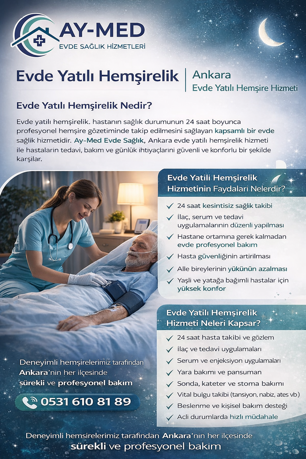 Ay-Med Evde Sağlık, Ankara’da evde yatılı hemşirelik hizmeti denildiğinde güvenilir, profesyonel ve sürdürülebilir çözümler sunar.