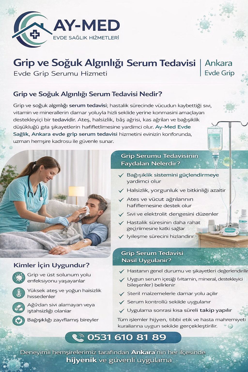 Ay-Med Evde Sağlık, Ankara’da evde grip ve soğuk algınlığı serum tedavisi denildiğinde güvenilir ve profesyonel çözümler sunar.