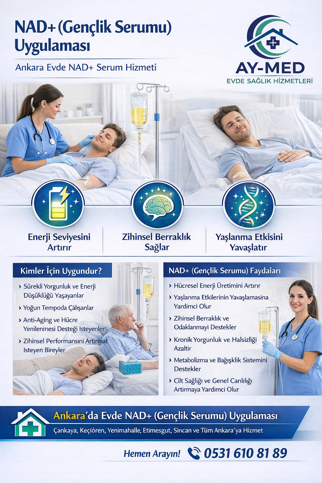 Ay-Med Evde Sağlık, Ankara genelinde NAD+ (Gençlik Serumu) uygulamasını evinizin konforunda, uzman hemşire kadrosu ile güvenle sunar.